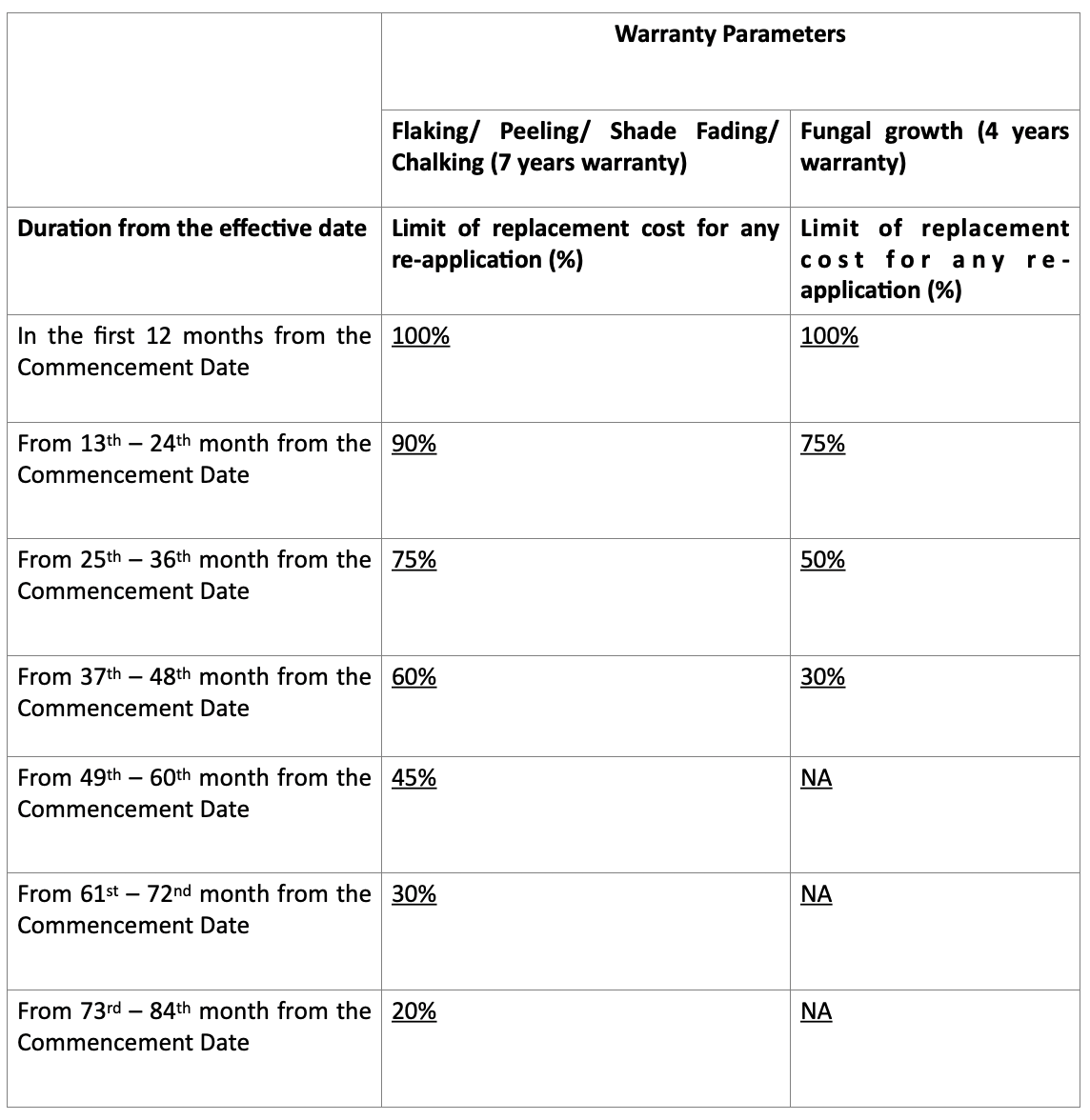 i. This warranty only provides for replacement cost of paint (“replacement cost”) as per the reducing scale provided hereinafter, solely for re-application purposes, in order to set right the affected areas. The Company shall at its own discretion decide on providing replacement of the Product or providing replacement cost of the Product in terms of the reducing scale provided hereinafter.