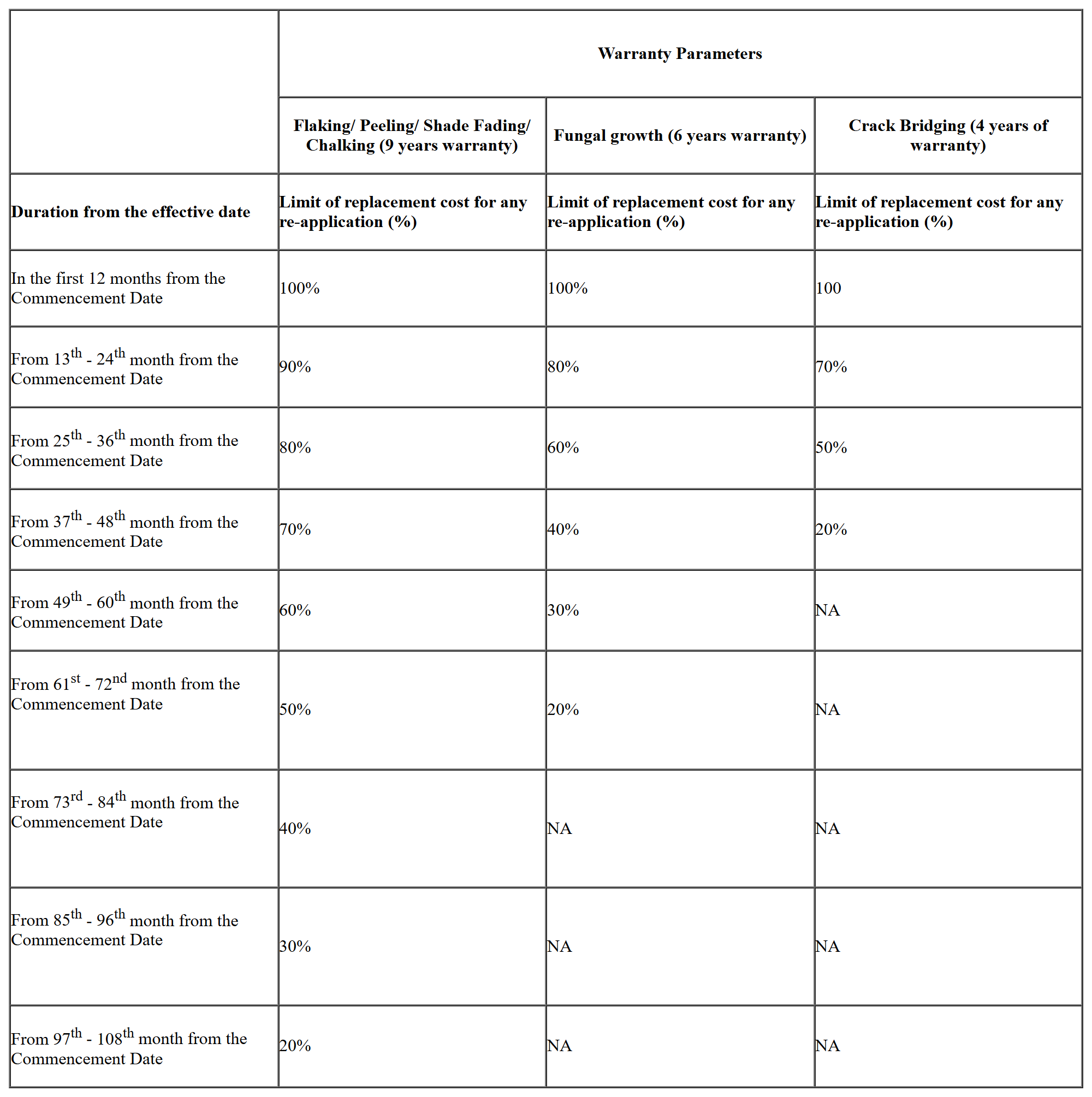 i. This warranty only provides for replacement cost of paint (“replacement cost”) as per the reducing scale provided hereinafter, solely for re-application purposes, in order to set right the affected areas. The Company shall at its own discretion decide on providing replacement of the Product or providing replacement cost of the Product in terms of the reducing scale provided hereinafter.